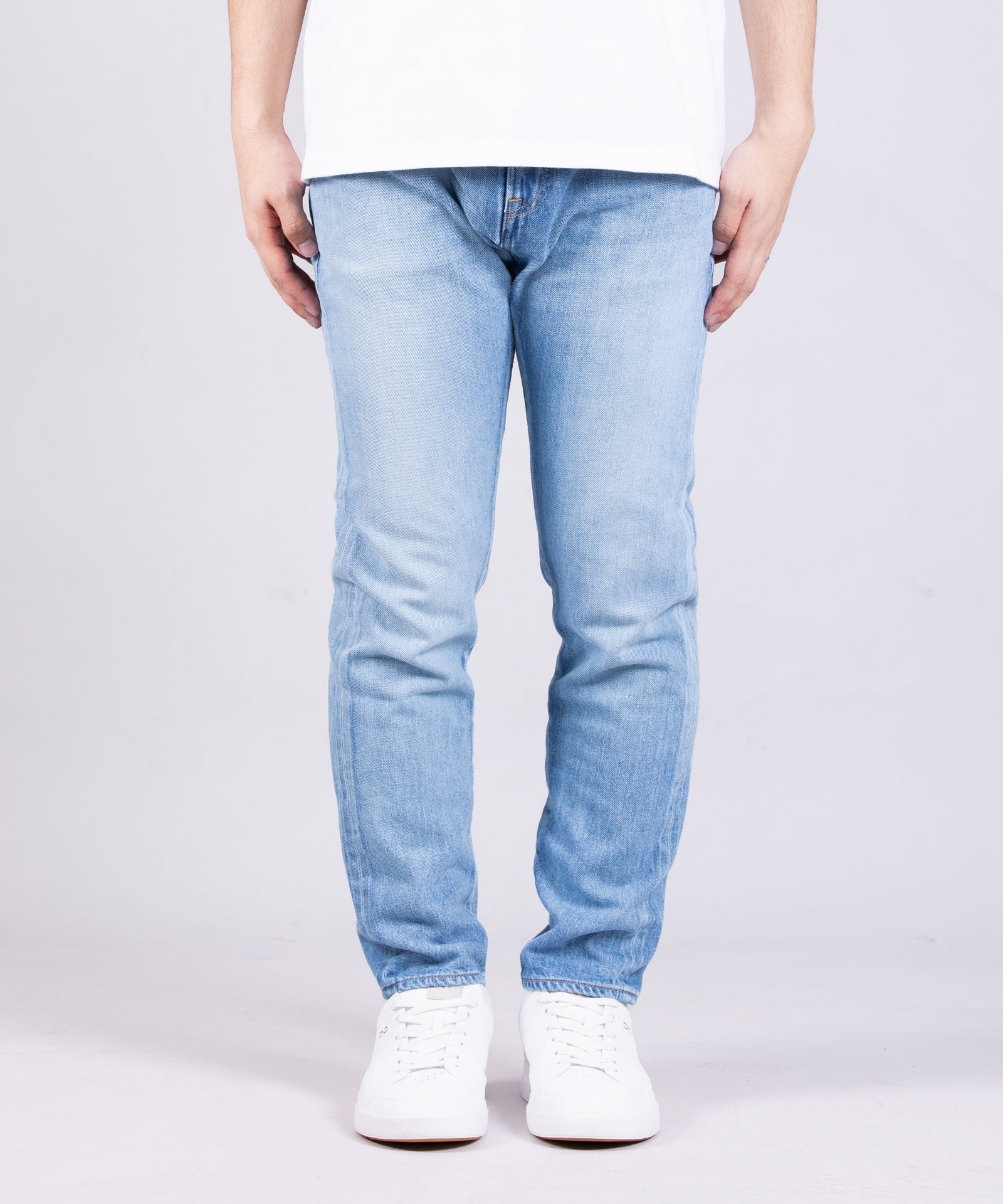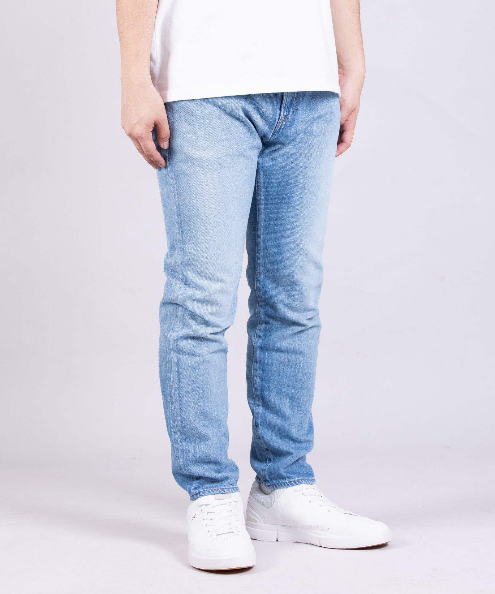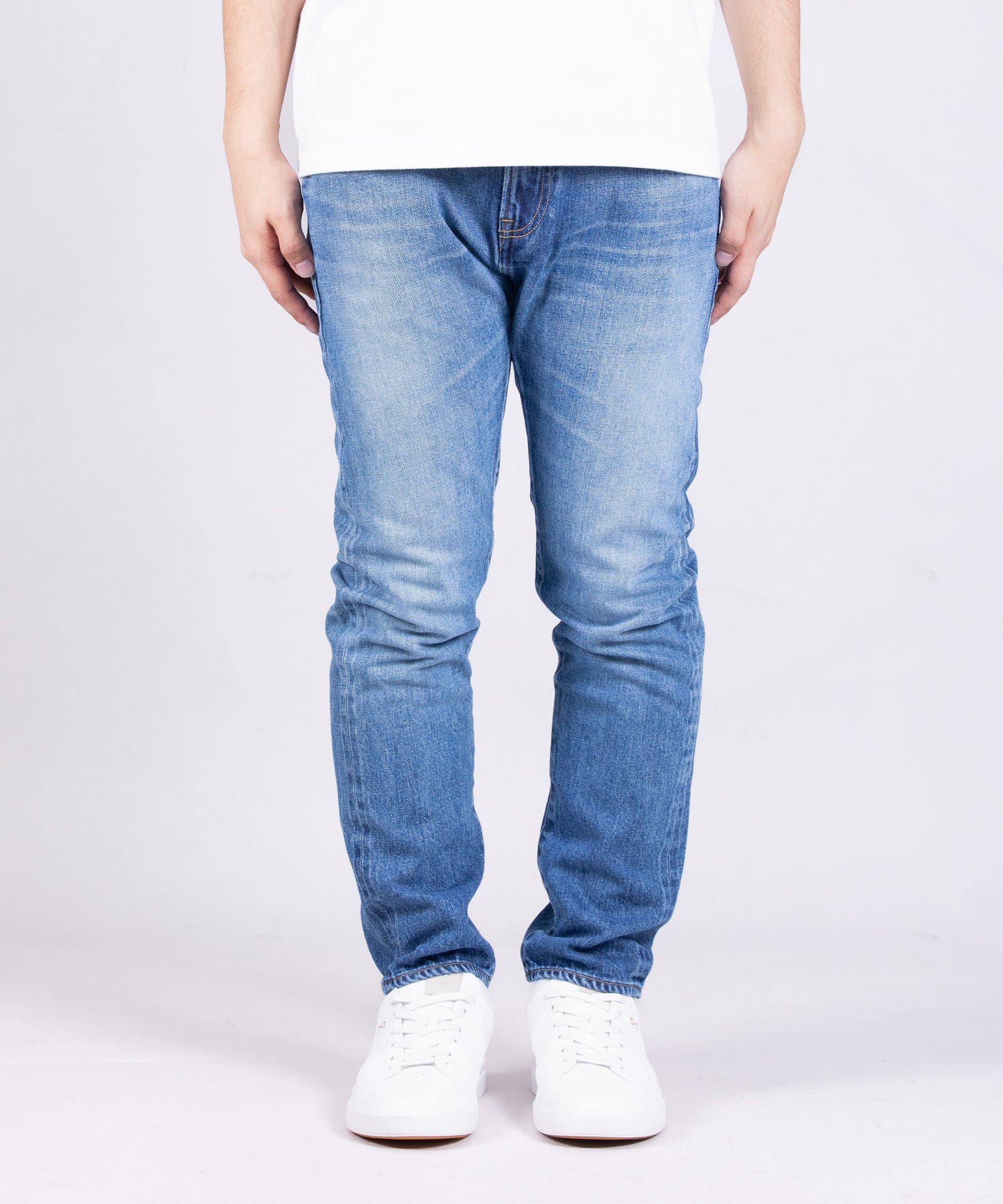 11oz ブルーセルヴィッチ スリム Aging Washは、脚のラインを美しく見せる洗練されたスリムシルエットが特徴です。太ももから裾へと緩やかにテーパードした設計により、スタイリッシュな印象を与えます。7×10番手の11ozデニム生地は、本格的な日本製デニム特有の色落ち感を保ちながらも、軽量で柔軟な着用感を実現。エイジングウォッシュ加工により、あらかじめ濃淡の鮮明なコントラストとアタリ・ヒゲが表現され、長年着用したかのような本格的なユーズド感と清涼感を両立させています。