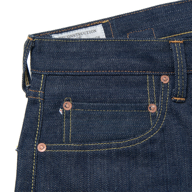 STUDIO D'ARTISAN's first model is the world's first vintage selvedge jeans, "DO1". The fabric of the "DO1" that was newly created for this project was reproduced by studying the original fabric and recreating the number of twists and unevenness of the No. 6 thread, which was spun by the spinner. The dyeing process was done with Tokushima Tadeshoai "kase dyeing", and the process of "dyeing, drying, dyeing, drying" was repeated 20 times, with no time or effort spared, to dye it dark blue. The stylish thickness inherited from French work is maintained in this new "DO1".