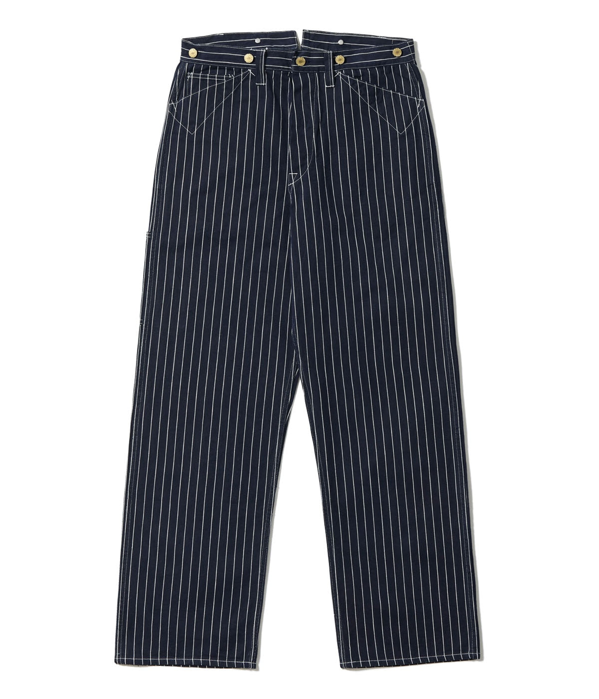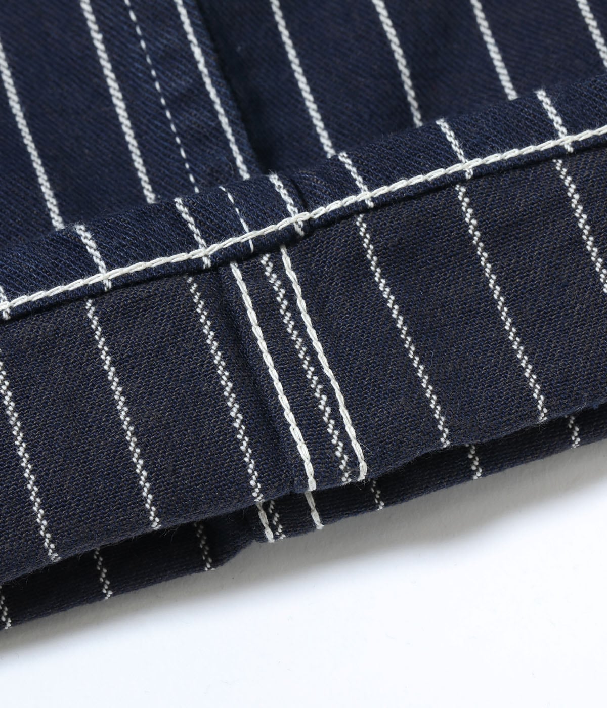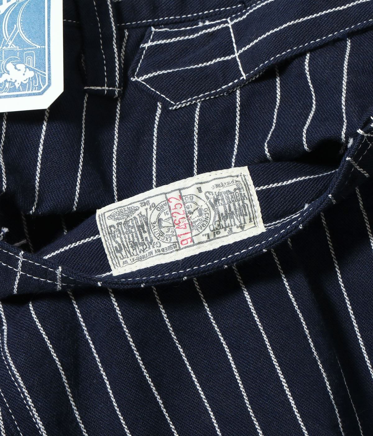 今回は1914年の広告で掲載されていた、ヴィンテージではほぼ現存していないウーブンストライプデニムのアイテムを展開。プリントではなく、織りで表現したストライプを強調していることから、明らかにStifel社などのウォバッシュストライプに対抗したものと思われる。販売店で配布されていたノベルティのノートに付いていた生地スワッチから分析を行い、10番手の綿糸をインディゴと生成、チャコールの3色を使用し、左綾で作製している。