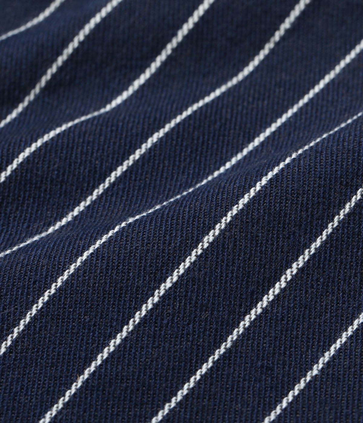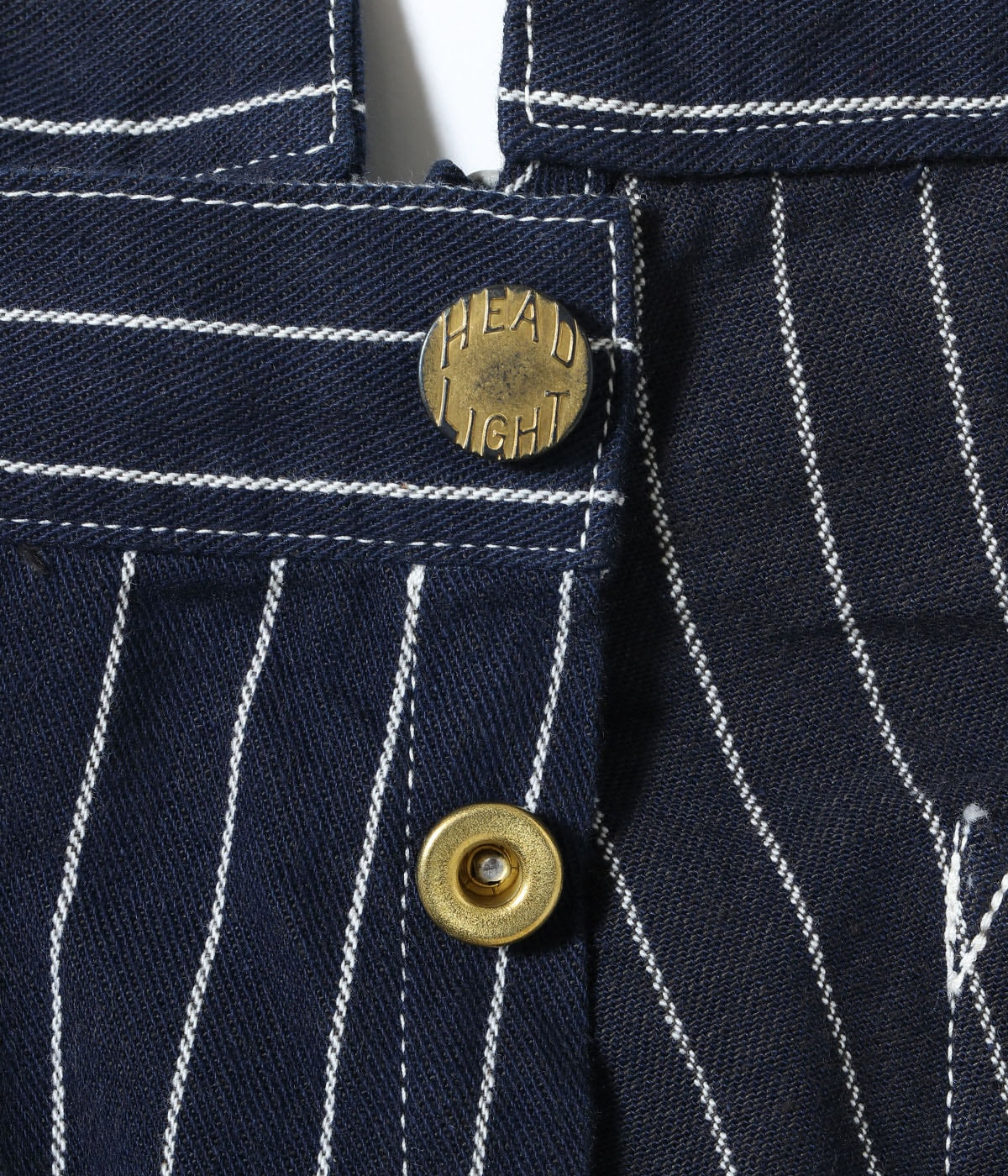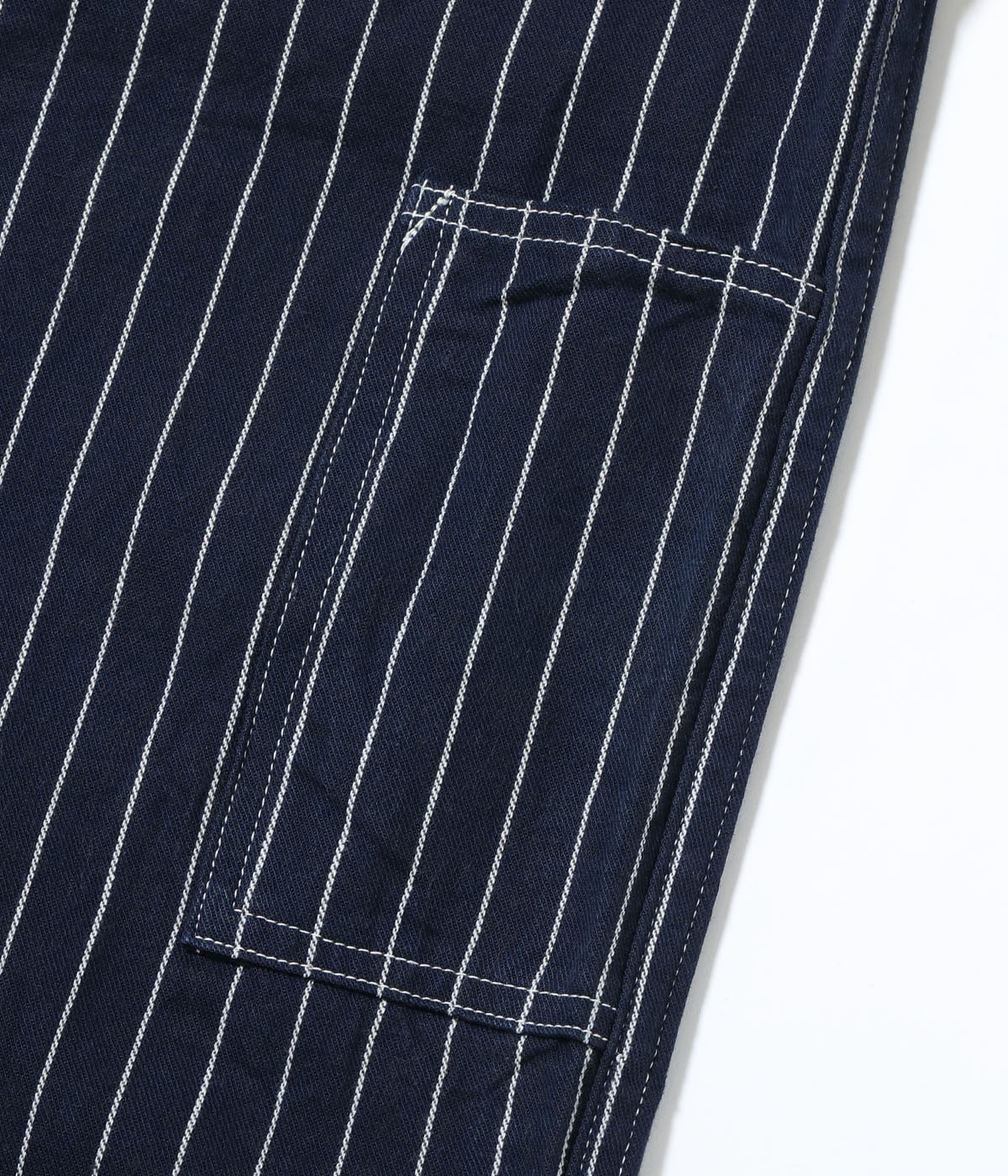 今回は1914年の広告で掲載されていた、ヴィンテージではほぼ現存していないウーブンストライプデニムのアイテムを展開。プリントではなく、織りで表現したストライプを強調していることから、明らかにStifel社などのウォバッシュストライプに対抗したものと思われる。販売店で配布されていたノベルティのノートに付いていた生地スワッチから分析を行い、10番手の綿糸をインディゴと生成、チャコールの3色を使用し、左綾で作製している。
