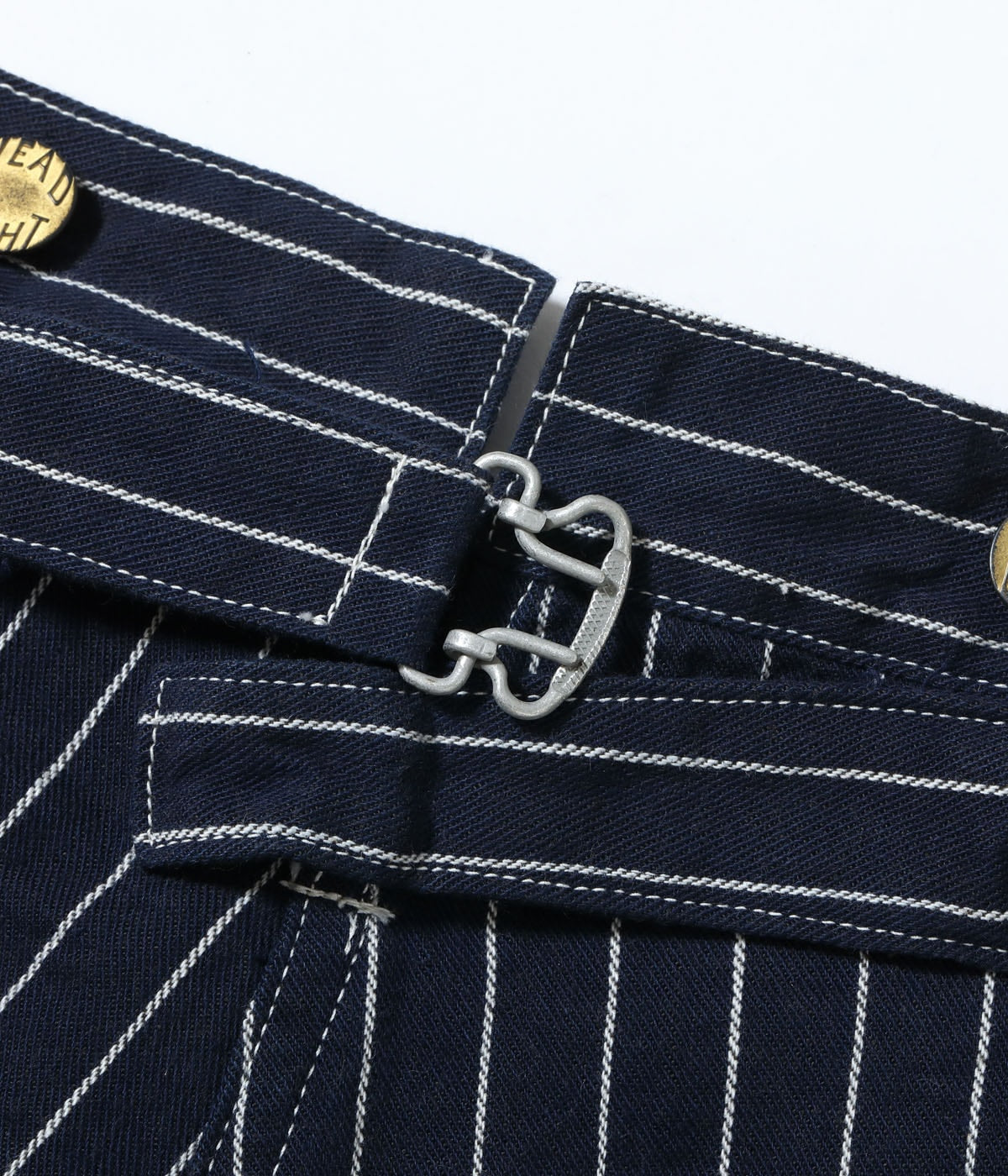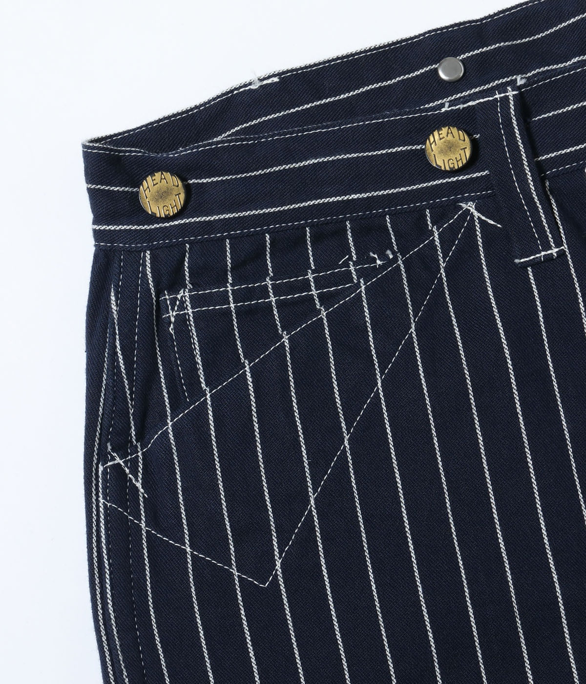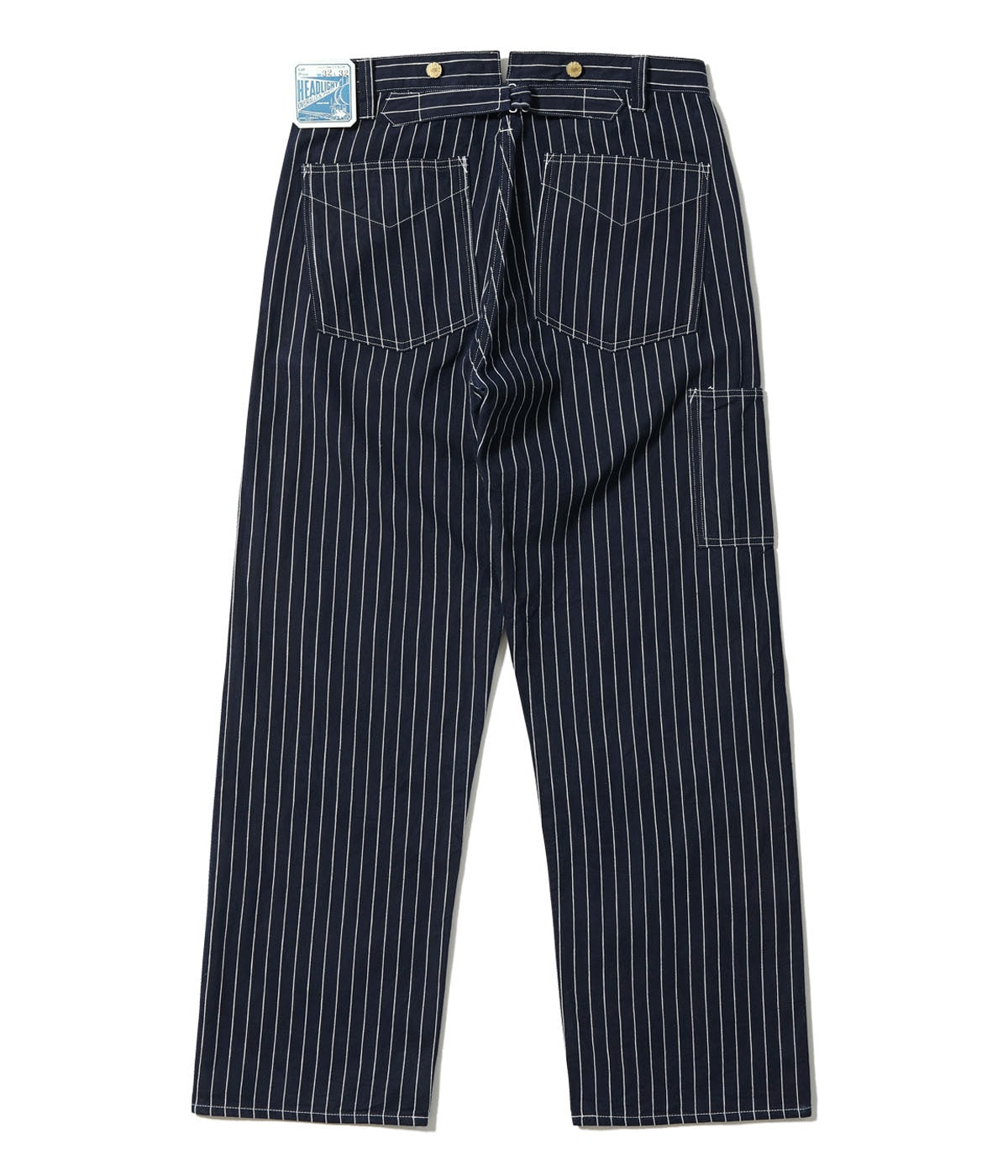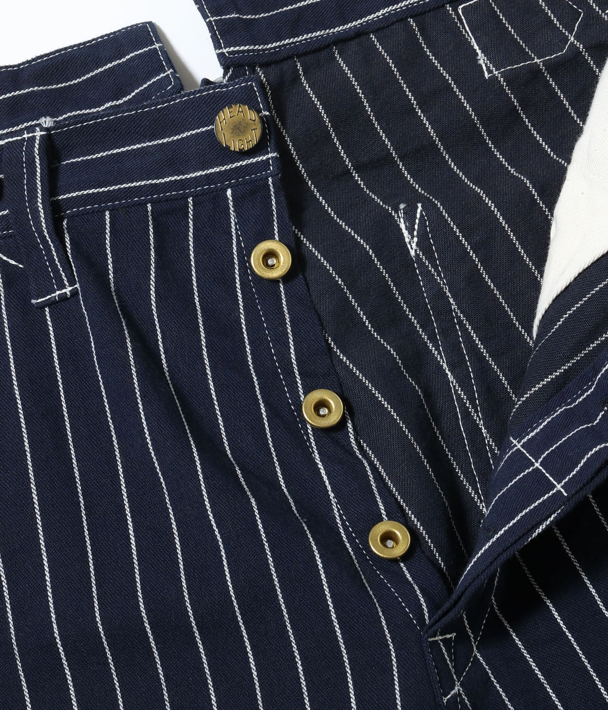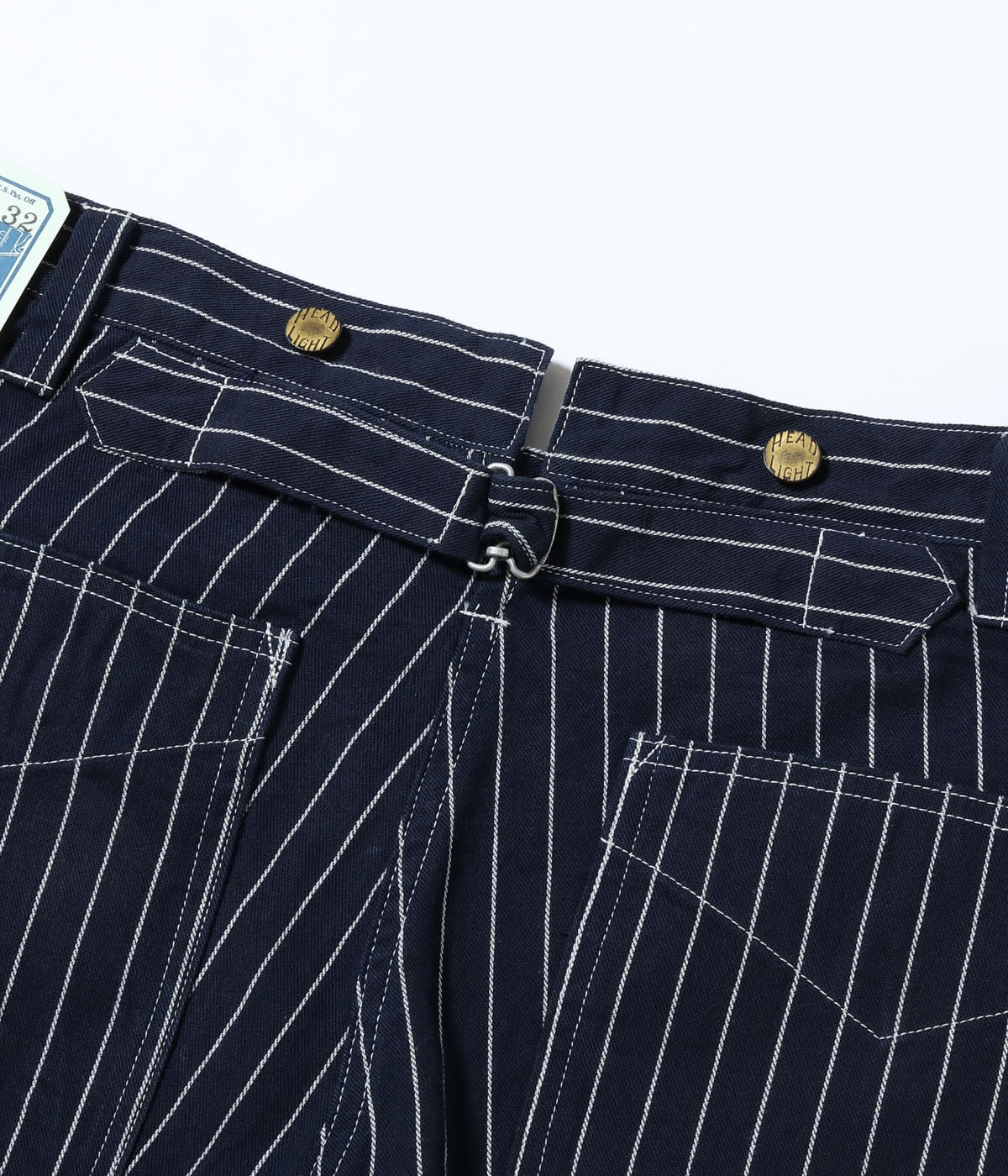 型はヘッドライトでは未確認のアイテムではあるが、のちに提携するクラウンオーバーオールズで1914年にリリースされていたLot No.903 Pantaloon Overallをベースに作製。501XXより8年も早くベルトループが採用されているのが特徴。オーバーオールに近い太めのシルエットで、こちらもウエストはシンチバックで調整可能。脇は巻き縫いのためセルビッジが隠れているが、腰ポケットの内側で確認することができる。