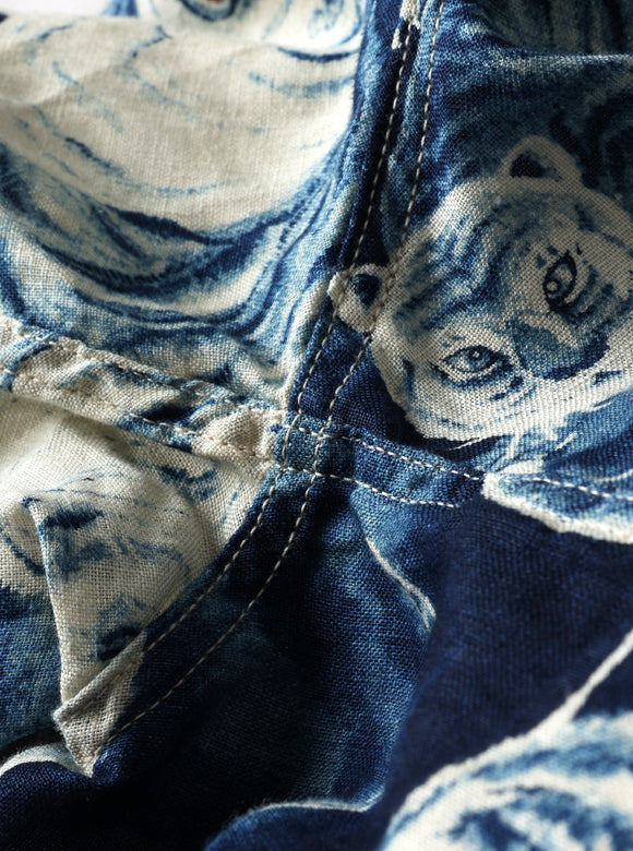 リネン生地をインディゴ染めで仕上げ、手捺染で柄入れを行っています。