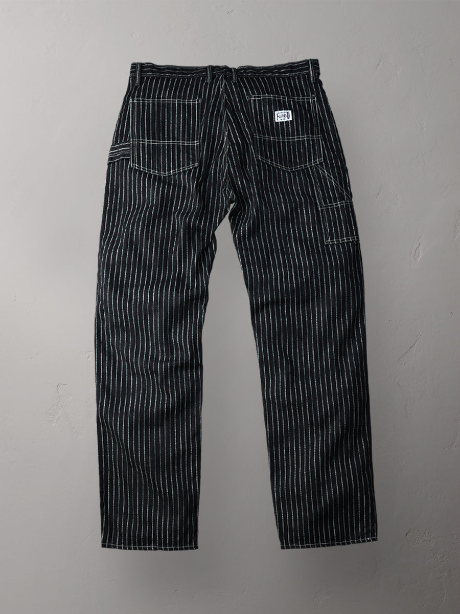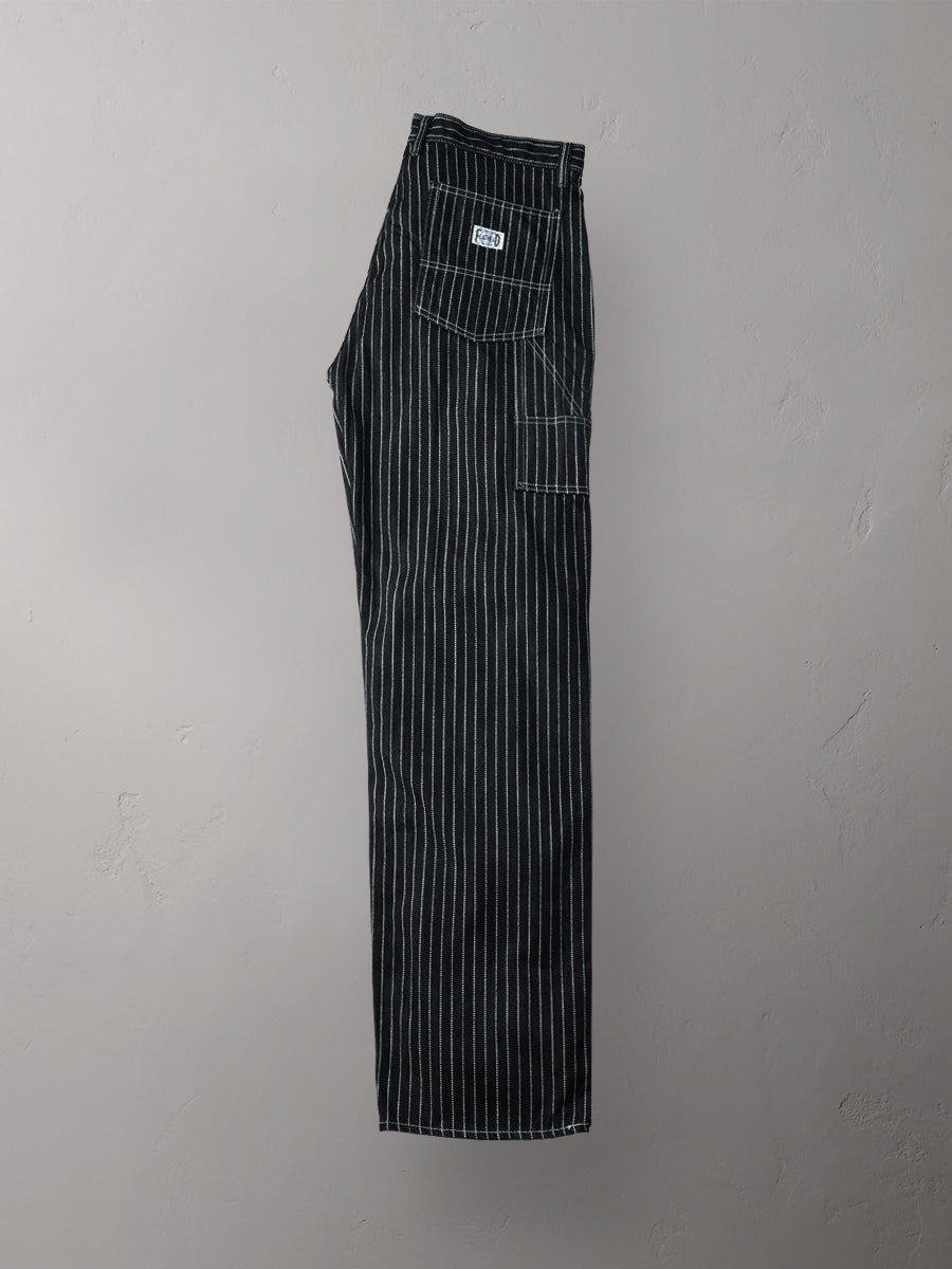 デニム生地にドット抜染でプリントされた白いストライプ状のラインが特徴的なウォバッシュ生地を使ったダブルニーペインターパンツ。