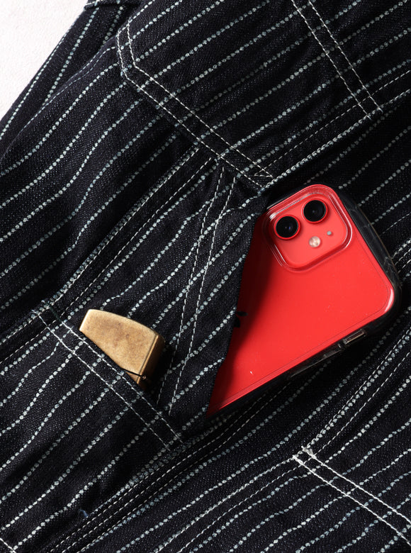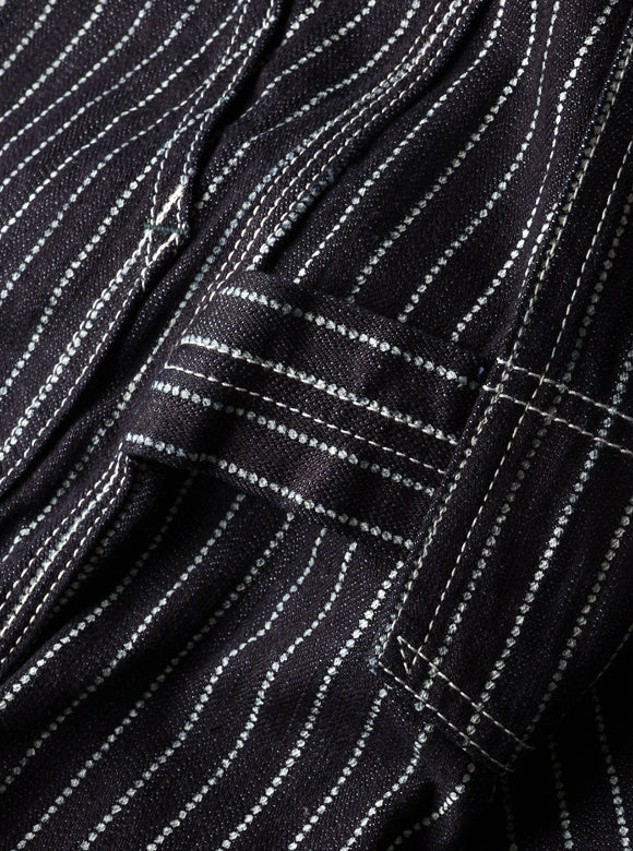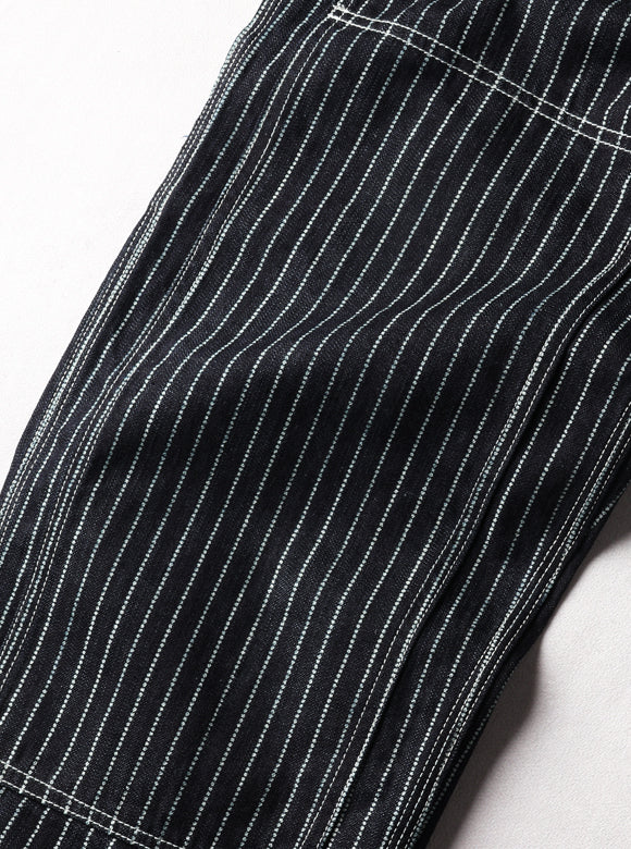 デニム生地にドット抜染により白いストライプ状のラインが特徴的なウォバッシュ生地を使ったダブルニーペインターパンツ。