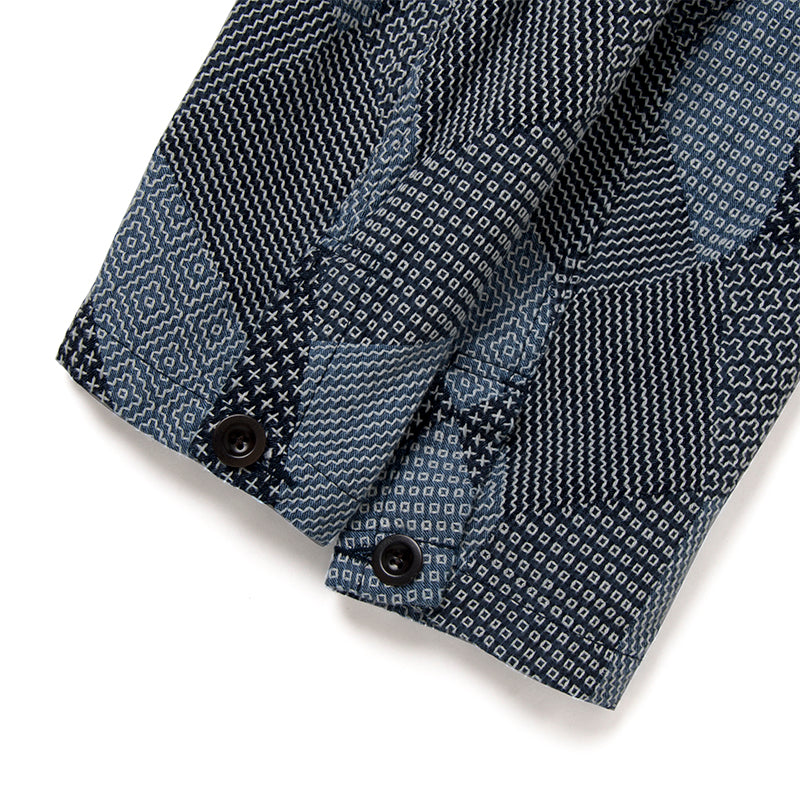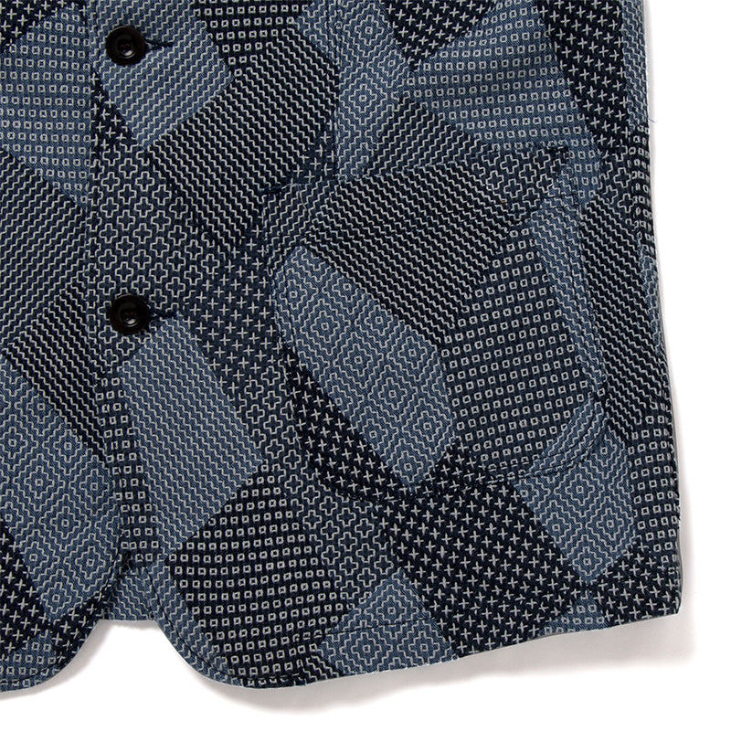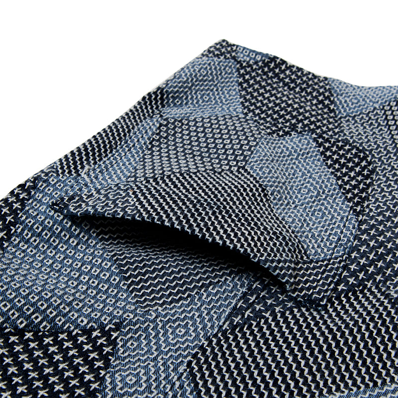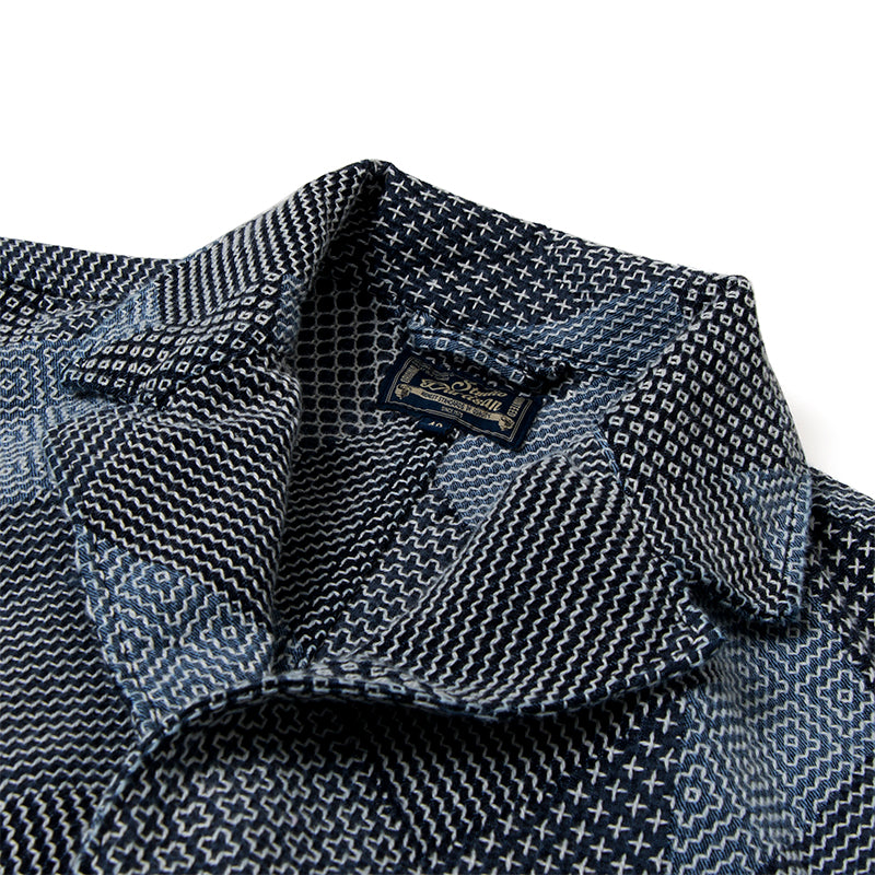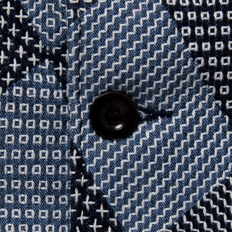 二色の異なるインディゴカラーと数種類の刺し子を組み合わせた複雑な織りで立体的に仕上げています。タテヨコに走る刺し子糸は手の温もりを表現し、複雑な向きに太番手の糸を走らせる事で生地に洗いをかけた時に様々な向きから太番手の糸が収縮し、生地の表面に複雑な凹凸が現われるように設計しています。繰り返し着用する事で二色のインディゴカラーの経年変化をお楽しみ頂けます。ナットボタンを使用しています。