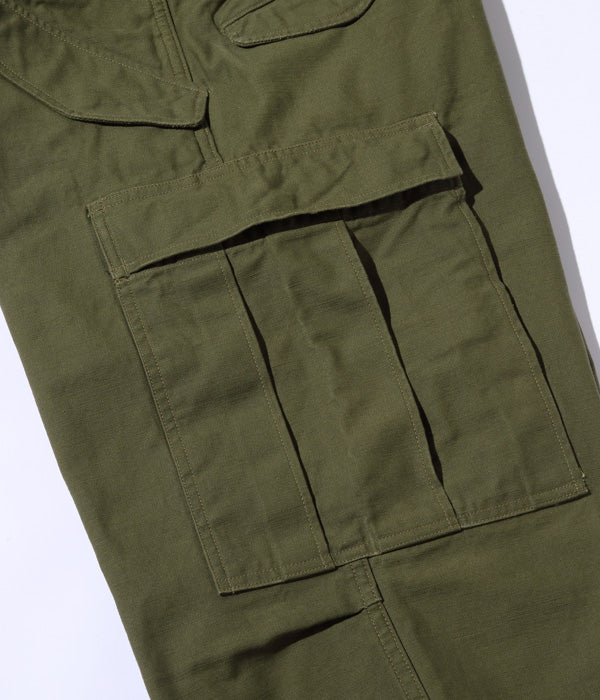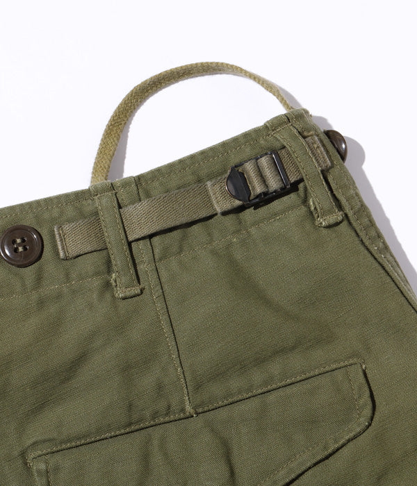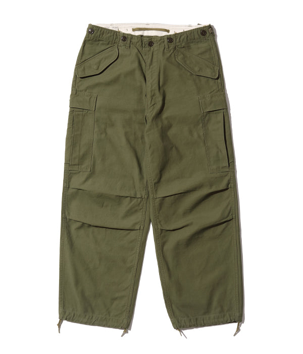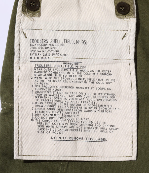 米陸軍が1951年に採用したコットンサテン地を裏使いしたフィールドトラウザース。陸軍はこの頃、寒冷地用の戦闘服としてM-51シリーズのセットアップレイヤードシステムを採用した。アンダーシャツ、ドラウァー(ズボン下)を履いた上にウール製のフィールドシャツとフィールドトラウザースを着用し、更にその上からコットン製のフィールドジャケットとフィールドパンツを着用した。いずれのM-51も寒冷地での着用を考慮し、ルーズフィットにすることで体温を閉じ込め、外気を遮断する効果を重視している。ウエスト内側に設けられたコードループは、サスペンダーの先端に付いた金属製のフックを引っ掛けるためのディテールである。