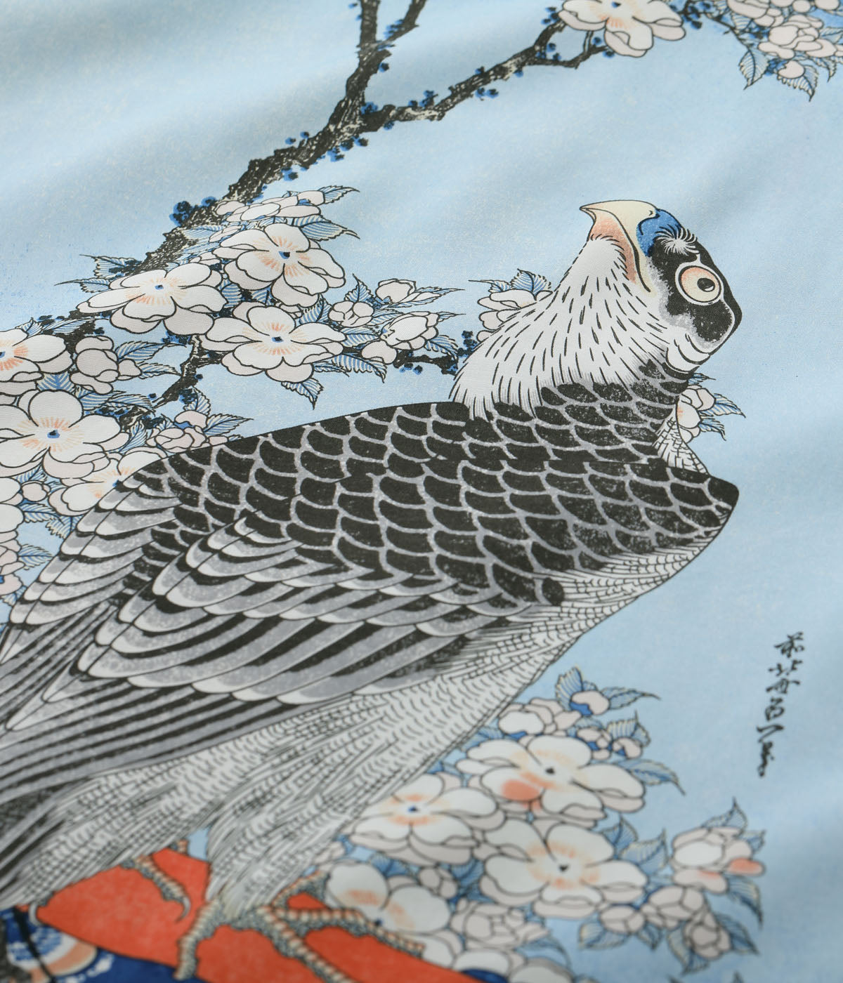 北斎は50歳を過ぎたあたりから、「鳥」を題材とした作品を多く手掛けているが、その大半は通常の絵師が好んだ華麗な鳥類ではなく、猛禽類を映したものであった。本作品は、満開の桜を背に鷹狩りに用いる鷹の凛とした姿を描いている。鷹は止まり木に組紐で繋がれていて、その羽根や足には細かな描写がみられる。本図は長大判と呼ばれる縦長サイズの作品だが、北斎が手がけた長大判の花鳥画は他にもいくつか知られており、「亀」「鯉の滝登り」「雪松に鶴」「牧馬」などの吉祥絵がある。
