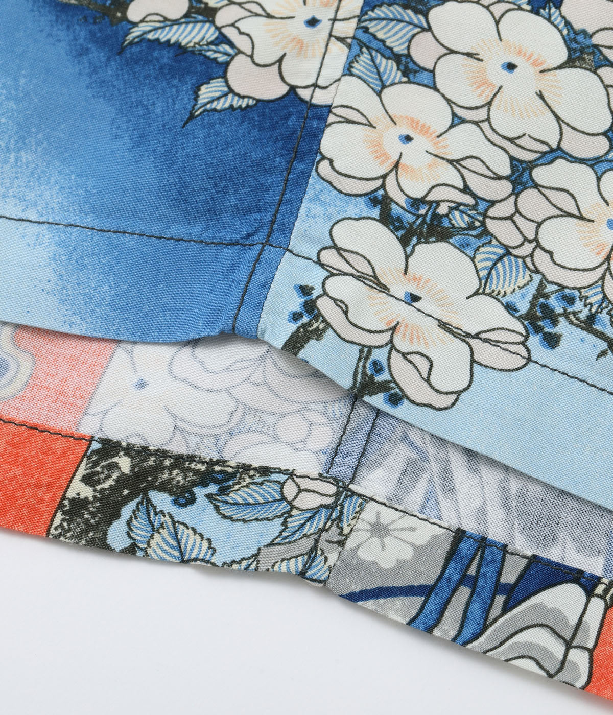 当時の北斎が作品に「藍」の顔料を使用したこだわりを継承し、このアロハシャツも藍顔料を使って捺染しているのが特徴。