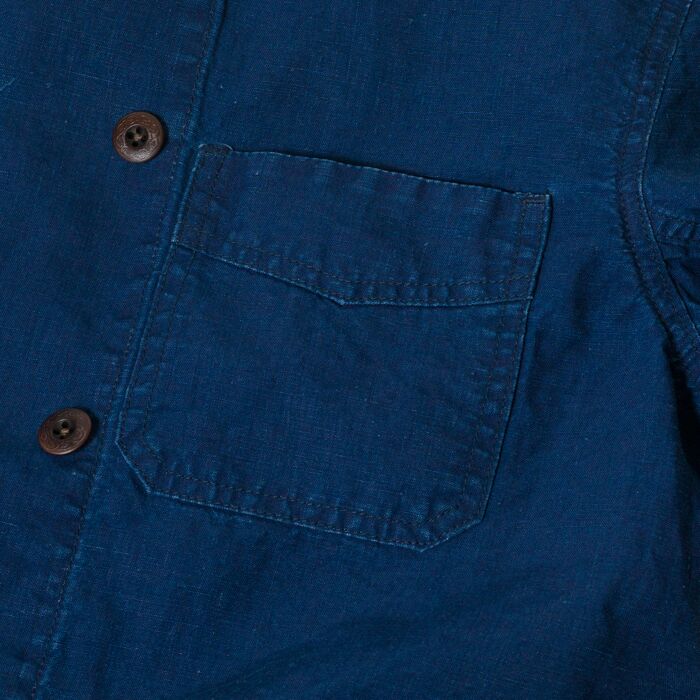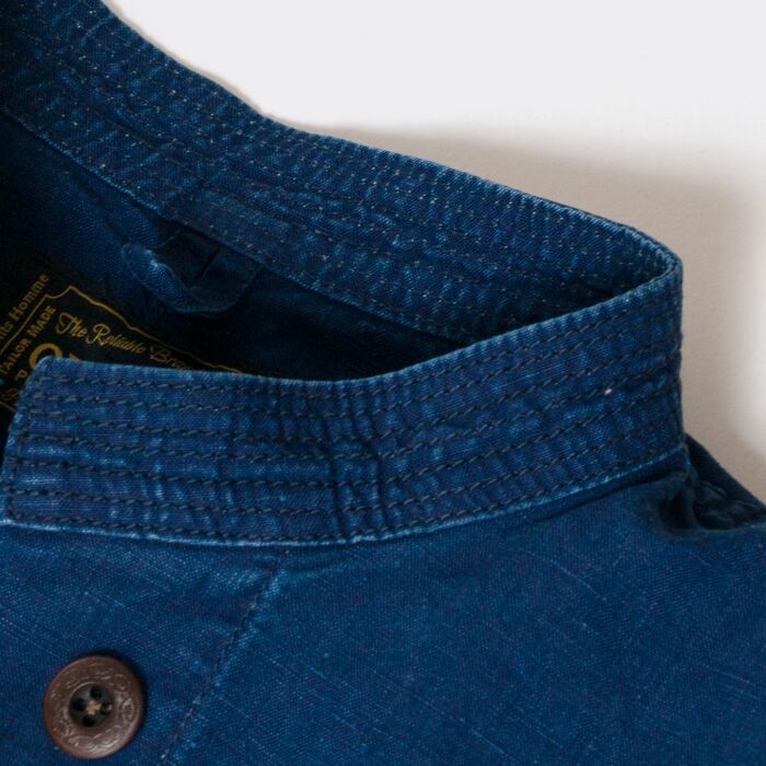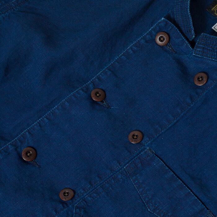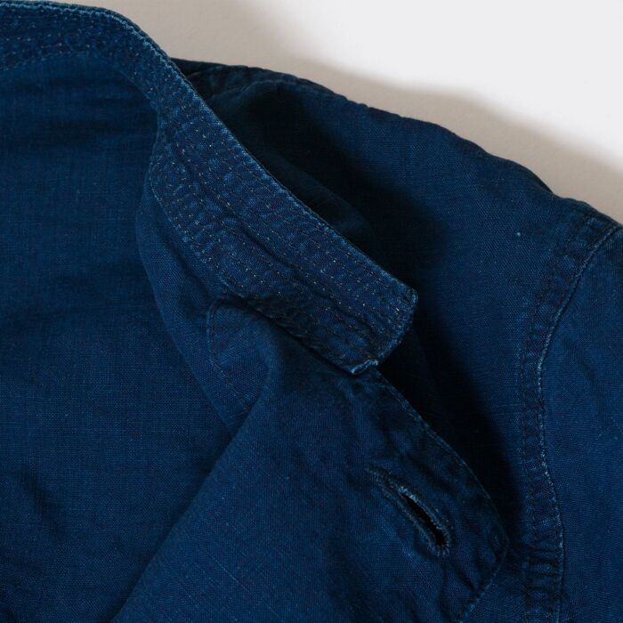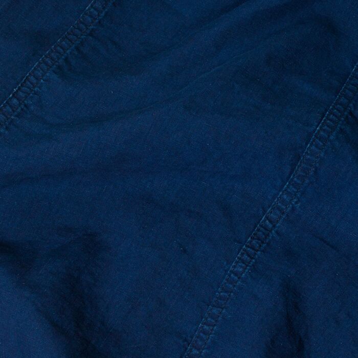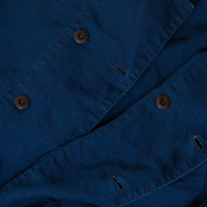 1900年代初頭のインディゴ・ダブルブレスト・ジャケットがデザインモチーフ。特徴的なVポケットの形状、防風のためのダブルブレスト、襟のステッチは強度を高め、美しい立ち上がりを実現するために施されております。素材には当時と同じくインディゴ・リネンを使用し、ヴィンテージ感を出すために色落ち加工を施し雰囲気を演出しています。