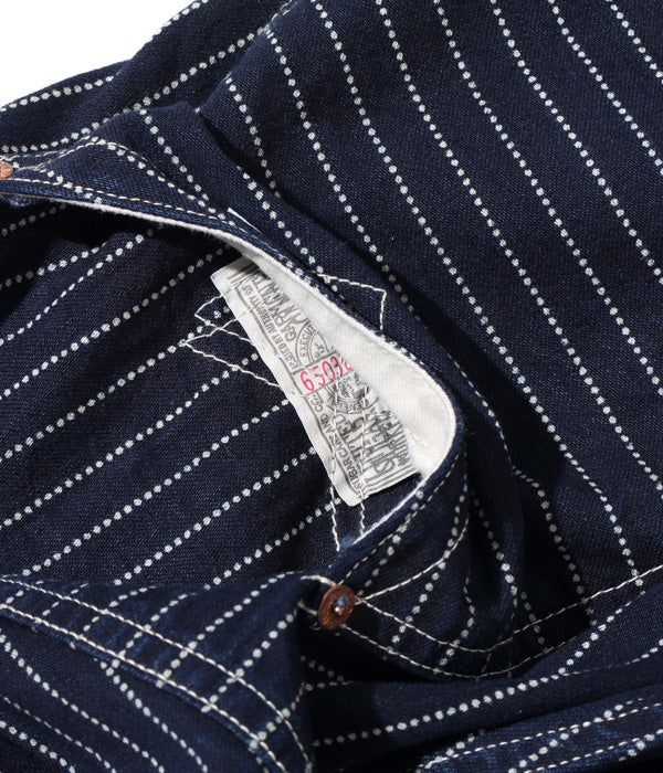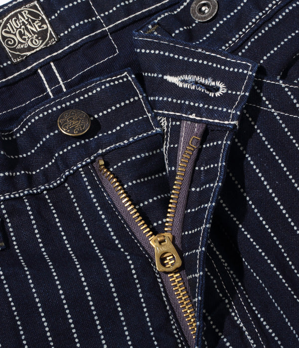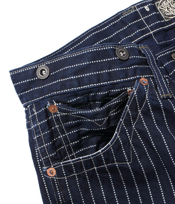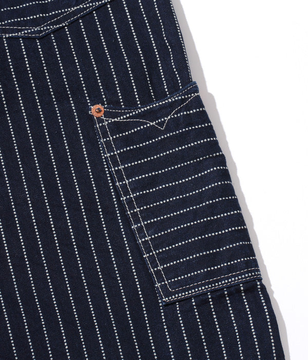 9オンスのウォバッシュストライプ生地を使ったショートパンツ。カーブしたポケットの形状やポケット口のステッチワークなど、20世紀初頭のワークパンツに見られる手間のかかった豪華なディテールが特徴。