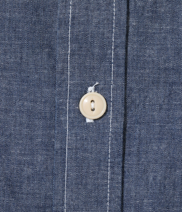 1950年代のシャンブレーシャツがベース。ワークウエアらしい3本針巻き縫い仕様のタフな作り。経糸にインディゴ糸、緯糸を白糸で織り上げたブルーシャンブレー生地を使用している。同型でロングスリーブモデルも展開。