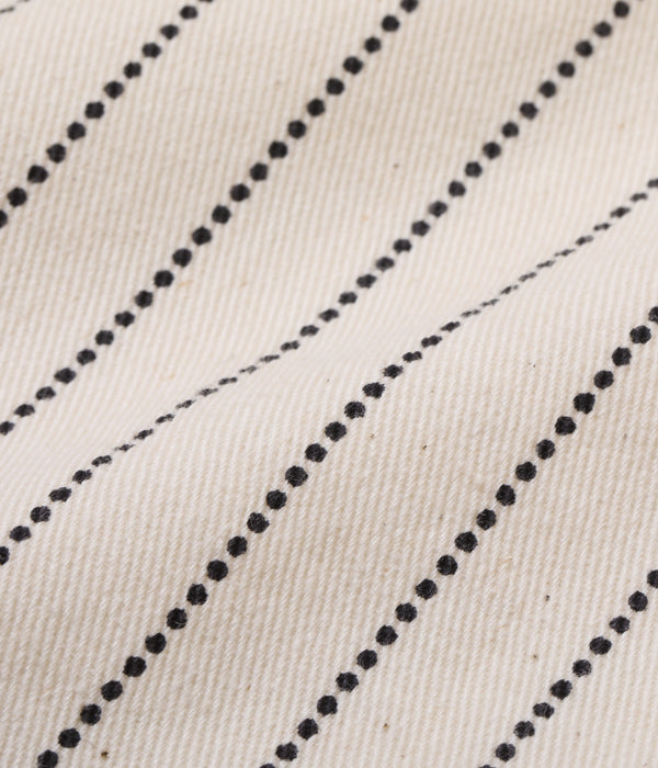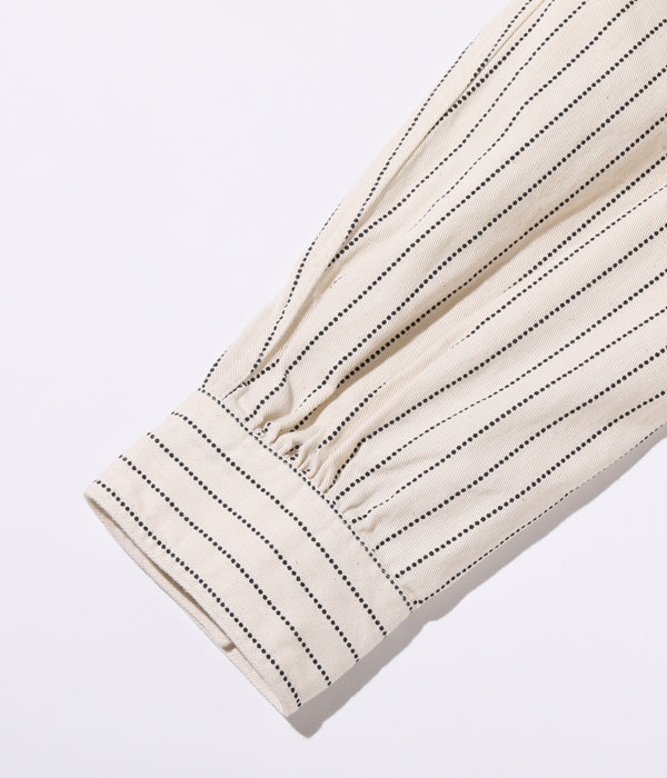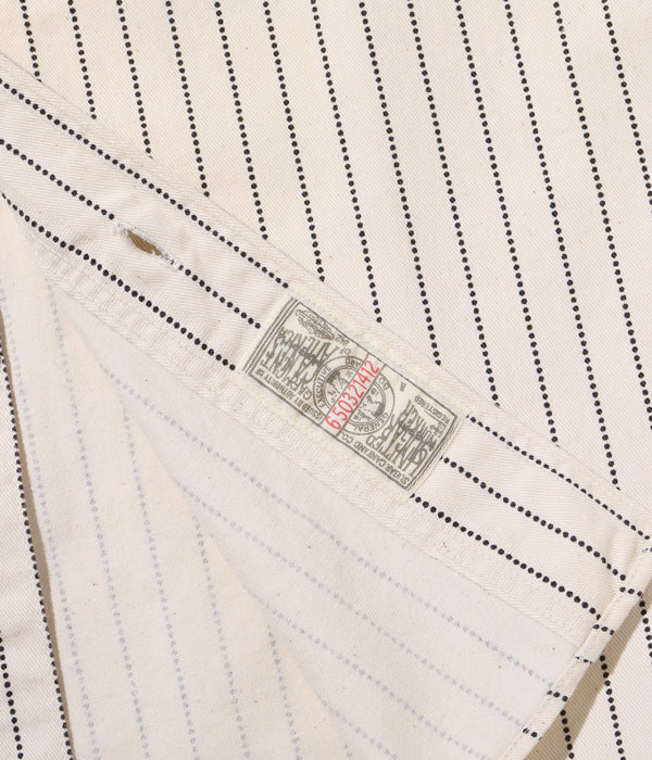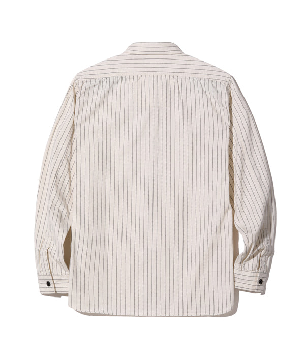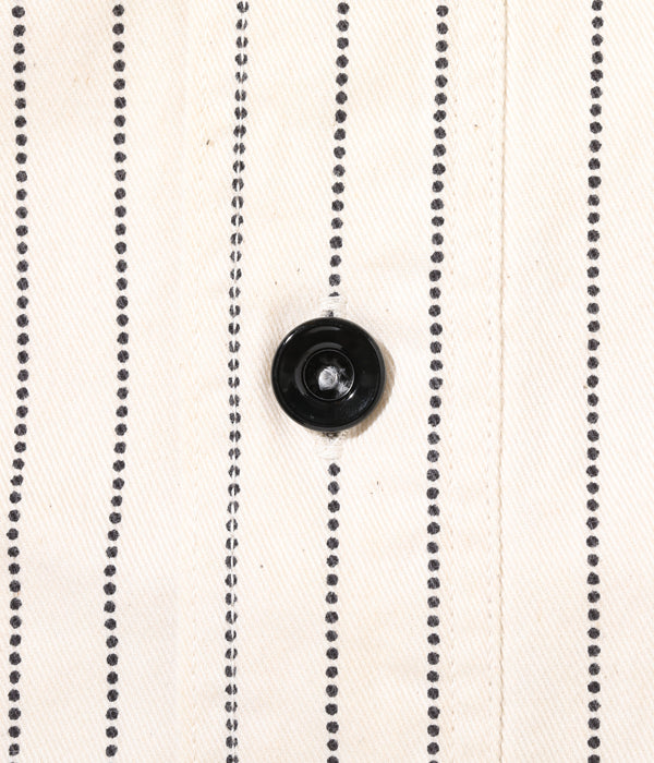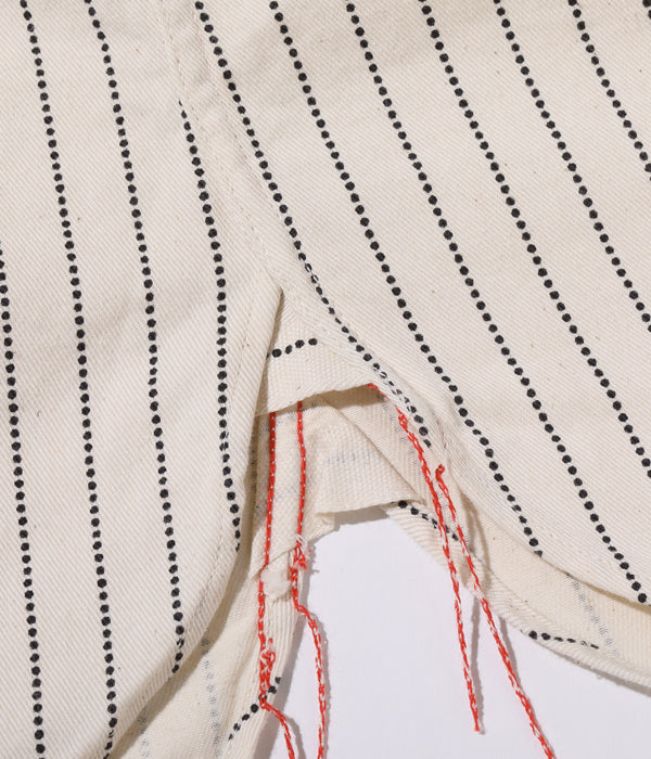 生成りの8.5オンスツイルにインディゴ染料でドットストライプ柄をプリントした「ホワイトウォバッシュストライプ」生地のワークシャツ。 色以外のディテールや縫製仕様などはインディゴウォバッシュストライプワークシャツ(Lot No. SC25551)と共通で、古い年代のシャツにみられる2枚袖仕立てなども特徴。同じ生地を使用したショートスリーブモデルも展開。