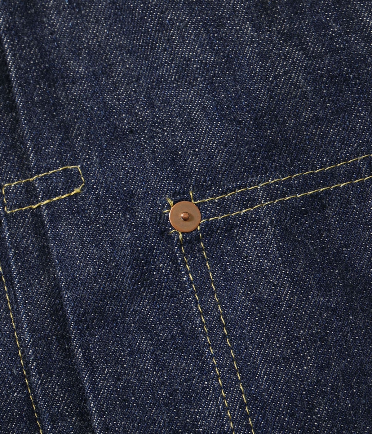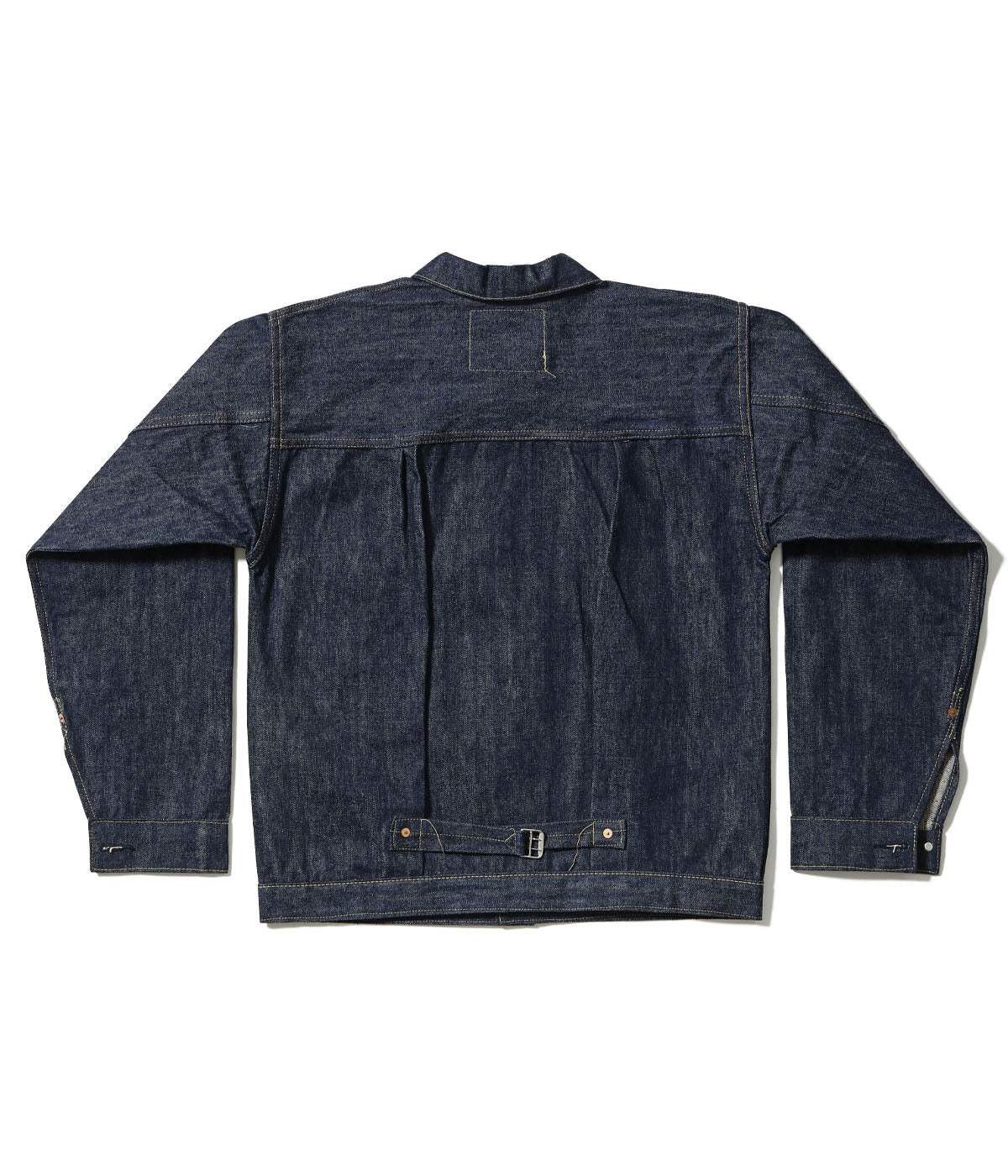 簡素化されたディテール、軍汎用のドーナツボタン、無地の鉄リベットなど「大戦モデル」を象徴するかのような特徴を持つ大戦後期、1945年モデルのデニムブラウス。もとにしたヴィンテージはワンウォッシュ、極上のミントコンディションのサイズ46インチ。さらにヴィンテージ市場で非常に人気の高いT-BACK仕様の個体を再現した。プリーツ部のボックスステッチはかなり小ぶりで、大戦モデルは一般的にオールイエローステッチと認知されているが、本作は一部にオレンジステッチも使用している。バックルは大戦後期のタイプを専用に製作。ムラが強く荒々しいデニムは、前回の1943年モデルともまた異なる魅力を持つ。襟の地の目、太めのカフスも個性的で、全体のサイズ感は大戦期特有の若干小さめの仕上がりとなっている。