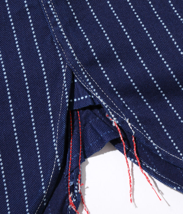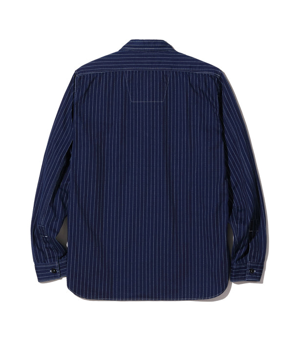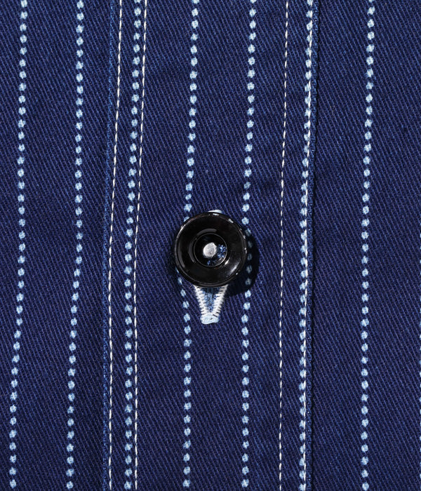 インディゴ染めした8.5オンスの生地をドットストライプ柄に抜染した「ウォバッシュストライプ」のワークシャツ。ワークウエア黎明期のヴィンテージをベースとしており、ディテールにドレスシャツの名残がみられる。同じ生地を使用したショートスリーブモデルも展開。