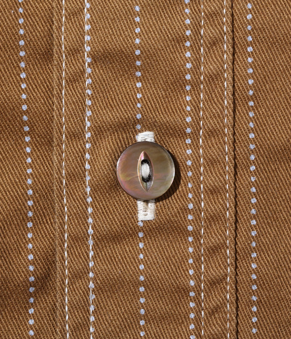 ヴィンテージに存在しない配色ながら、当時の材料や抜染技法を使って作られたフィクションロマンスらしい「ブラウンウォバッシュ」生地のワークシャツ。色以外のディテールや縫製仕様などはインディゴウォバッシュストライプワークシャツ(Lot No. SC36267)と共通。同じ生地を使用したロングスリーブモデルも展開。