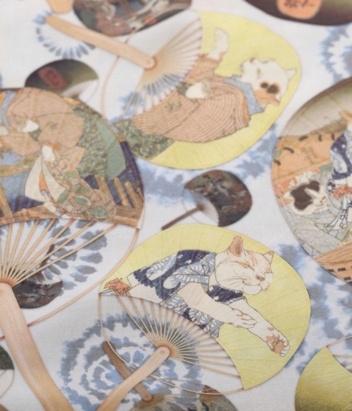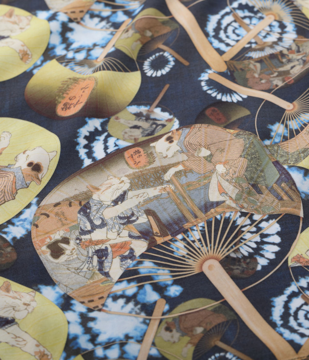 江戸に暮らす人たちの間で猫好きとして非常に有名であった国芳。猫を題材にした彼の作品はいくつも発見されており、資料として美術館や博物館に保管されている。それらの中で有名な作品のひとつが、この「猫のすゞみ」。猫たちが屋形船で夕涼みに出かける様子を描いている。芸者猫を迎え入れる船頭の猫と客の猫。芸者猫は手にアワビを持ち、タイトルの「猫のすゞみ」は鰹節で縁取られている。猫好きの国芳のユーモアがふんだんに盛り込まれた作品。