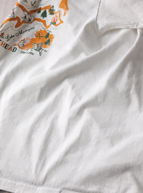 フロントにプリントされた地図や自然をモチーフとしたデザインが特徴的なTシャツ。